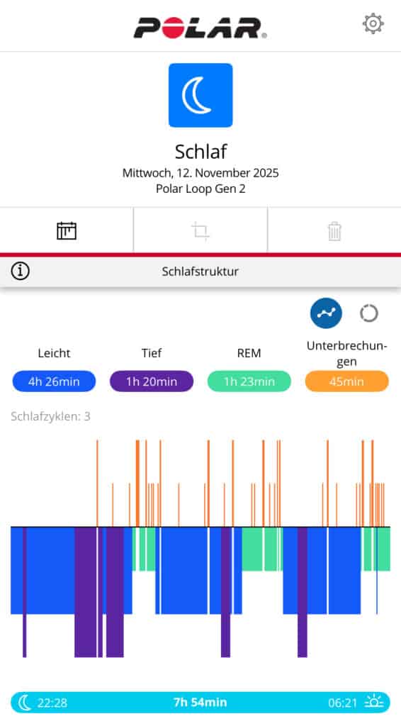Im Alltagstest überzeugte zunächst die Handhabung rund um den Schlaf: Direkt nach dem Aufwachen werden die Daten zügig in die App übertragen und stehen ohne spürbare Wartezeit zur Auswertung bereit. Positiv ist zudem, dass Polar neben den Messwerten eine kurze Selbsteinschätzung abfragt – auf einer fünfstufigen Skala lässt sich hinterlegen, wie man subjektiv geschlafen hat. Diese Kombination aus objektiven Daten und subjektivem Eindruck ist für die spätere Einordnung hilfreich, gerade an Tagen, an denen Zahlen und Körpergefühl auseinanderlaufen.
