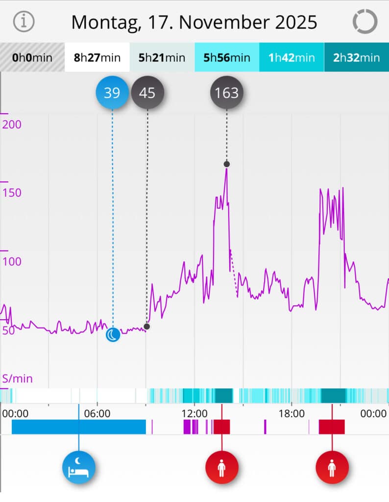 Insgesamt ist der Loop damit für eine Trainingsaufzeichnung, die wesentlich über Dauer und Herzfrequenz gesteuert beziehungsweise bewertet wird, im Test keine verlässliche Hilfe gewesen. Das hat unmittelbare Folgen für die Datenanalyse in der App: Wenn Belastungs- und Intensitätswerte während der Einheit maßgeblich aus der Herzfrequenz abgeleitet werden, sind entsprechende Kennzahlen bei unplausiblen HF-Verläufen nur eingeschränkt nutzbar. Wichtig ist jedoch die Differenzierung: Die Erholungsmetriken bleiben davon weitgehend unberührt und die Messung in Ruhe erwies sich im Test als schlüssig. Einen detaillierten Vergleich der exakten Herzfrequenz- und HRV-Werte gegenüber einem Whoop-Band sowie einer Garmin-Forerunner-Sportuhr führen wir zukünftig in einem separaten Testartikel fort.