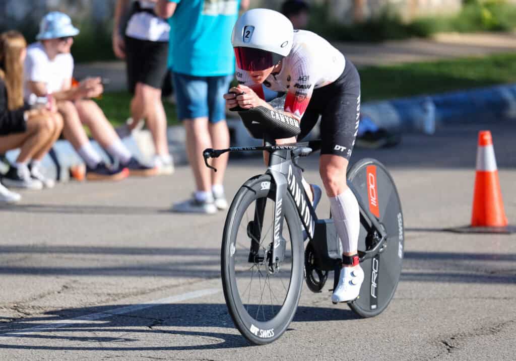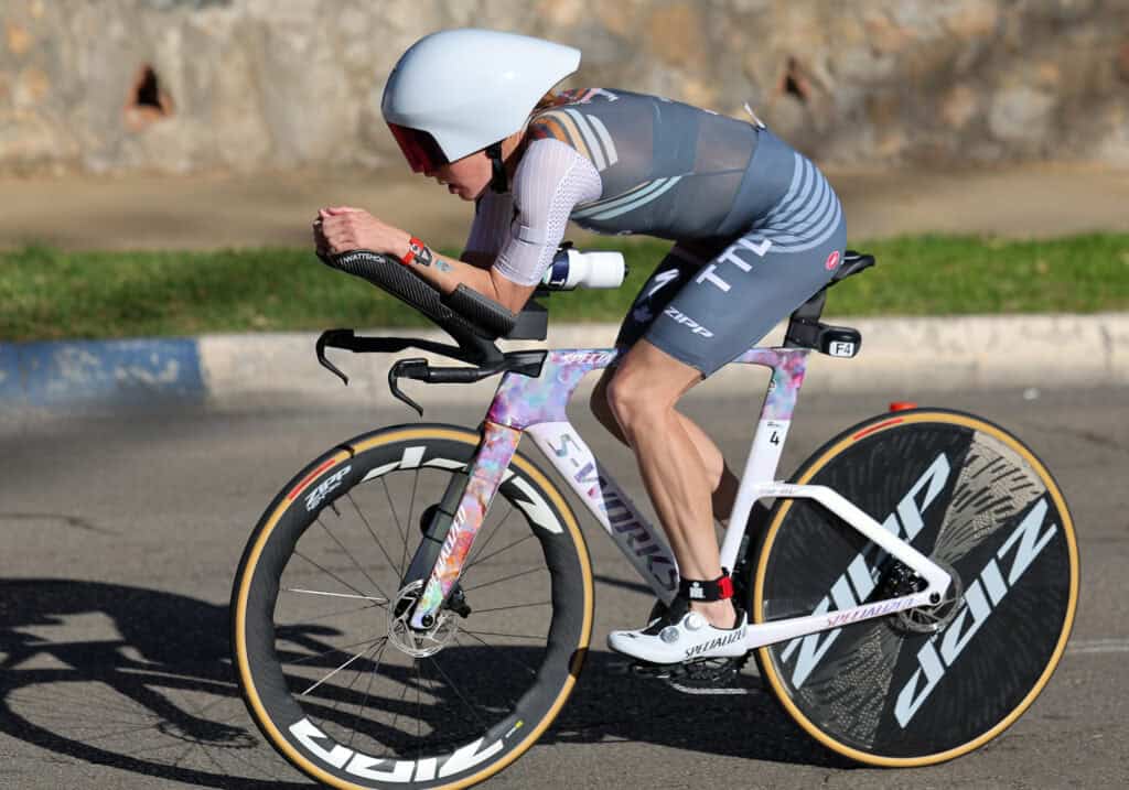 An Taylor Knibb führt auf dem Rad kein Weg vorbei. Die US-Amerikanerin absolviert die 90 Kilometer in 2:28:36 Stunden am schnellsten. T2 erreicht die 27-Jährige damit als Führende.